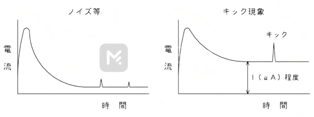 キック電流現象の有無の判定 キック電流現象とは、高圧の直流電圧を印加した際に一時的に測定電流が急増する現象を指す。これは主に、測定対象の絶縁物に水分が含まれていたり、ひび割れなどの重度の欠陥がある場合に発生する。 判定方法 絶縁抵抗測定を開... -