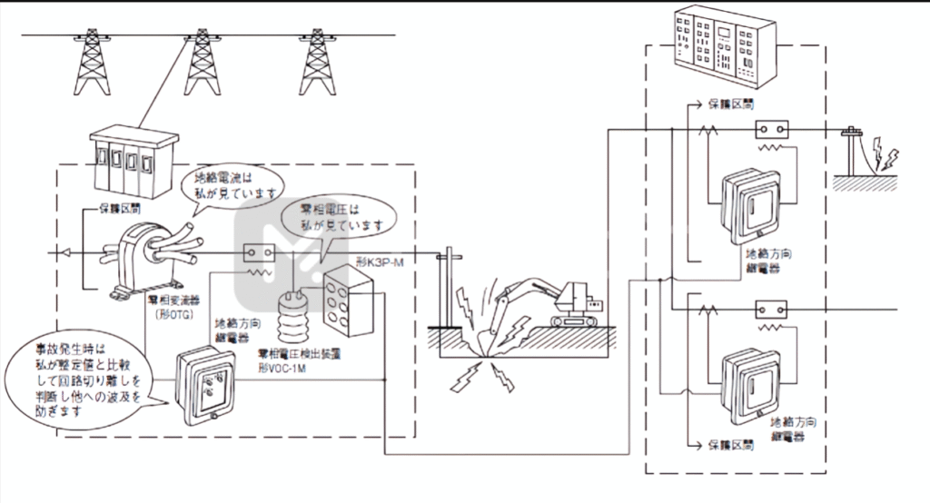 保護方式 地絡故障の保護方式としては、需要家の責任分界点に設置される地絡継電器を備えた高圧区分開閉器で構内ケーブル以降の高圧設備を一括して保護する方式が一般的に採用されている※出迎えケーブルなどで、地絡継電器を使用して主遮断器を動作させる... -