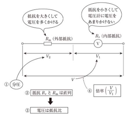 測定したい電圧の大部分をその抵抗に分担させ、電圧計自体には許容範囲内の電圧しかかからないようにする。