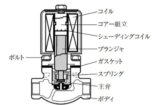 「電磁部(ソレノイド)」と「弁本体(バルブ)」の2つで構成されている。