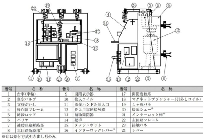 | 取出位置 | 盤の外へ完全に脱出させた状態。点検や交換時。 | 断路 | 断路 |