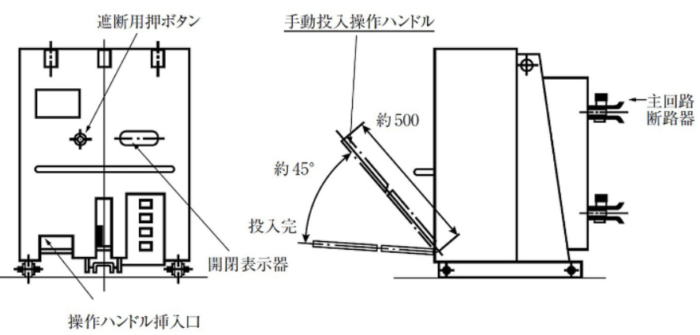 上左図:引き出し操作ハンドルを使った遮断器の引き出し方法