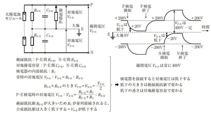 直流非接地回路の対地電圧は線間電圧を絶縁抵抗 RP-E と