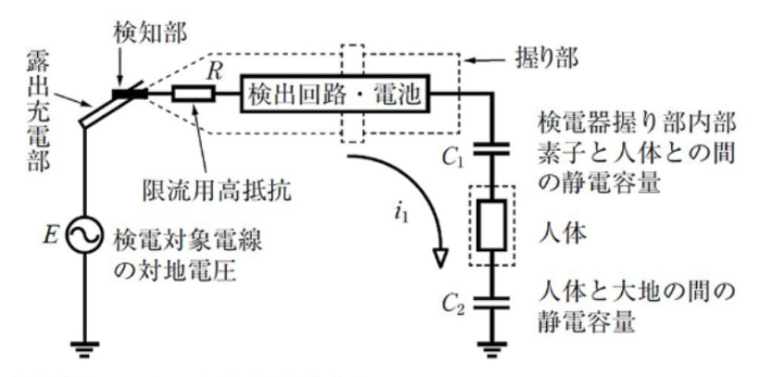 交流は静電容量を通って電流が流れるため、検電器の握り部を握り