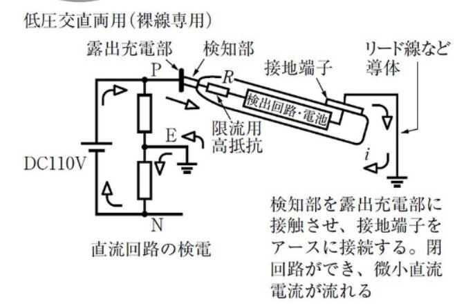 直流は静電容量を通って電流が流れないため、検知部を電路の露出充電部に接触し