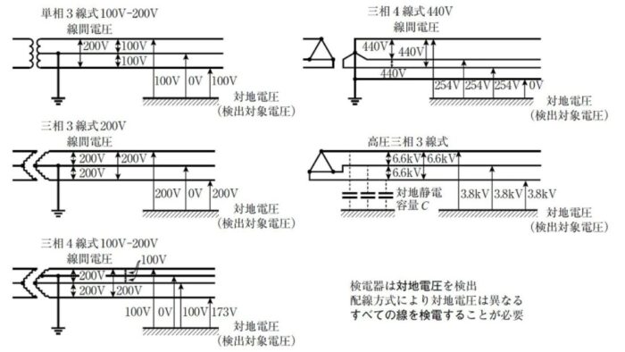 対地電圧は接地方式により異なるので、すべての回路を検電することが必要となる。