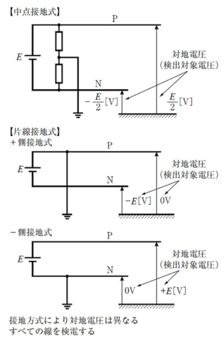 直流回路の接地方式には上図のように中点接地、+接地、-接地の3方式がある。