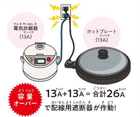 例)容量20Aの配線用遮断器の2次側負荷に電気炊飯器13Aとホットプレート13Aを同時に使用すると容量20Aを超える遮断器が作動して電気を遮断する。