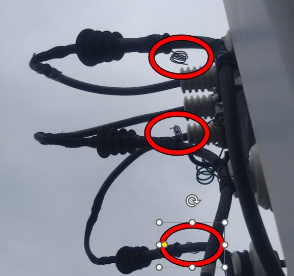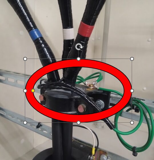 上右図は片側接地方式の非接地端(屋外のPAS2次側と接続しているケーブル)。