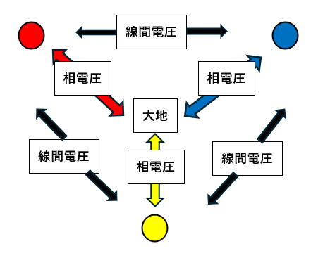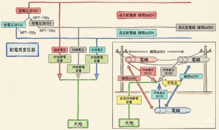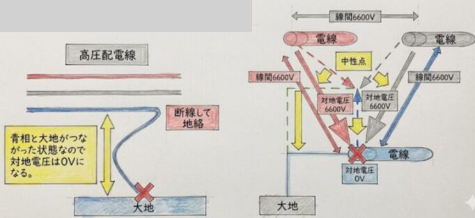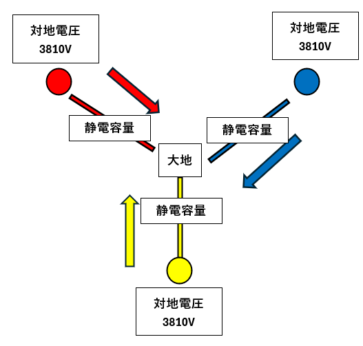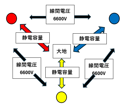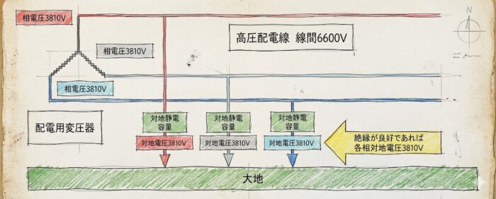 高圧配電線の絶縁が正常で地絡していない時は相電圧=対地電圧となり、