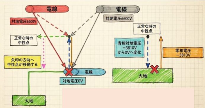 そのかわり赤相と白相の対地電圧が線間電圧と同じになり3810Vから6600Vへ上昇する。