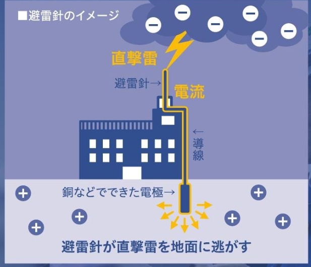 直撃雷の被害を防ぐための設備が避雷針。