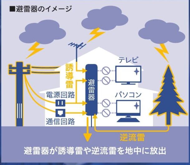 それが家の中に流れ込むと、避雷針だけでは防げず、中のパソコンや冷蔵庫が壊れる可能性がある。