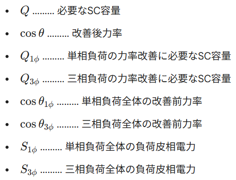 力率改善に必要なSC容量の具体的な計算式は下記を参照。