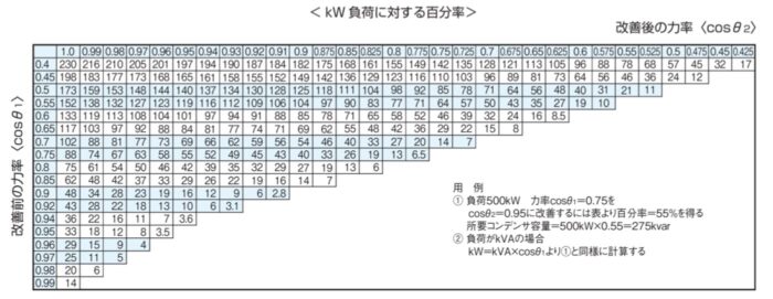 力率改善用コンデンサ容量決定表(参考)