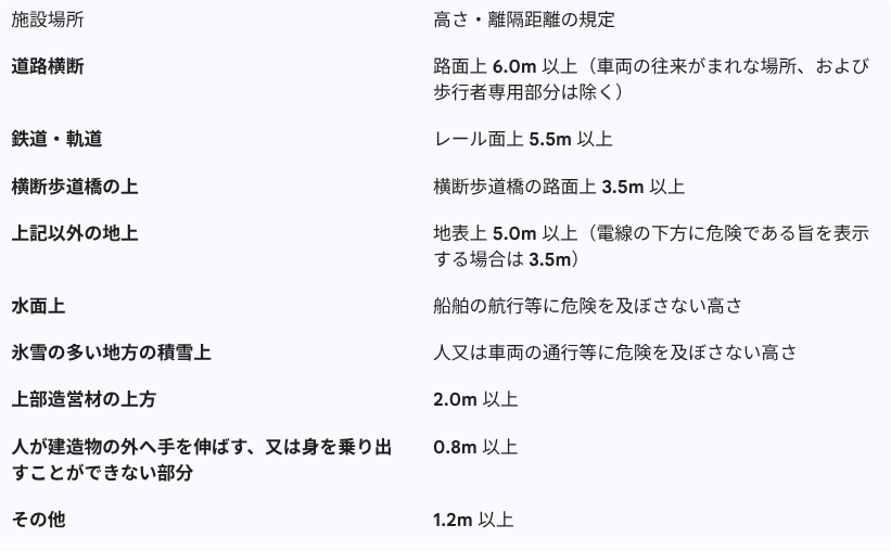 原則として地表から5m以上(交通に支障がない場合は4.5mまで緩和可)を確保する必要がある。