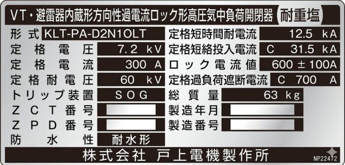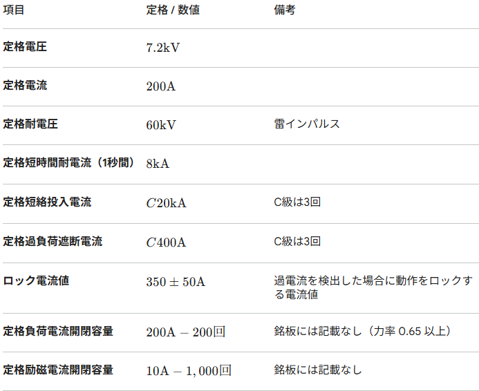 この銘板の区分開閉器の定格を、下表に示す。