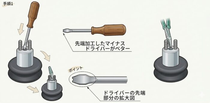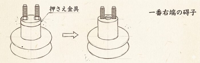 ③碍子をウエスで覆って、封印栓のマイナスネジをゆっくり弛める。