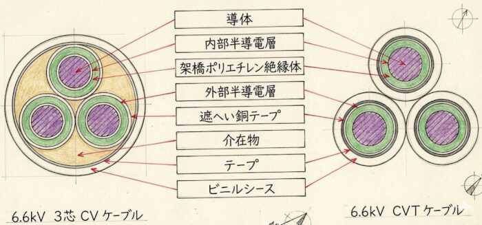 低圧ケーブルと異なるのは、絶縁被覆と外装の間に金属製の遮へい層があること。
