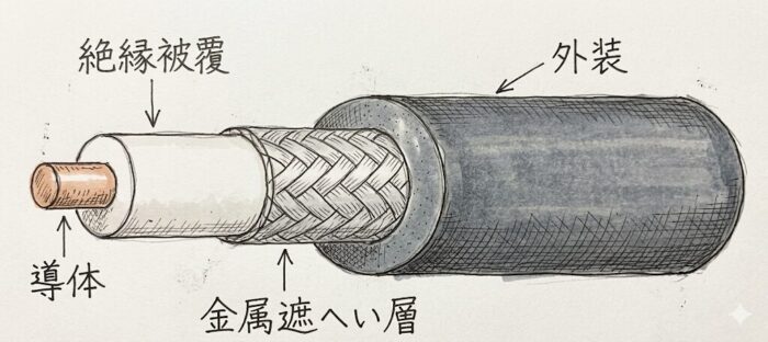 外部からのノイズの影響を抑え、ケーブル内部の電界を外部に漏らさないようにするための金属層。