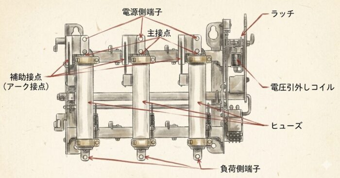 ※補助接点がない製品もあるが、その場合は主接点に消弧室が付属している。 - 消弧室