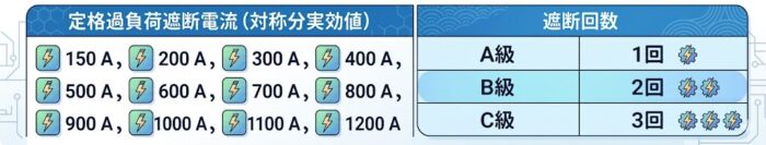 定格過負荷遮断電流は、規定の条件で遮断できる過負荷電流の限度のこと。