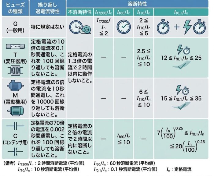 また、JIS C 4604 では限流ヒューズの繰り返し過電流特性と溶断特性が