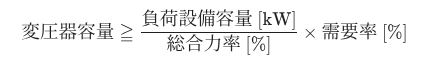 変圧器容量は、負荷設備容量や需要率などを考慮して、次式で求める。