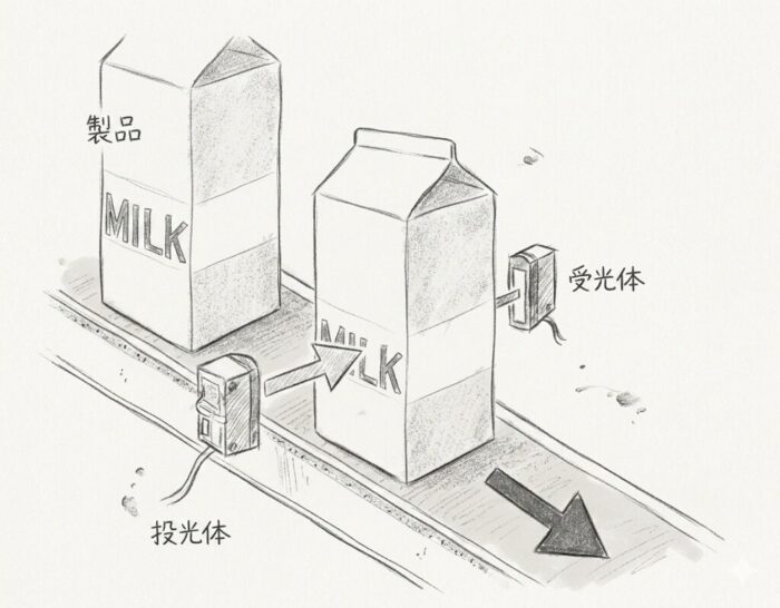 | 透過型 | 投光器と受光器を向かい合わせに設置し、間を通る物体が光を遮ることで検出。 | メリット 検出距離が長く 動作が安定している。 デメリット 両側に配線が必要。 |