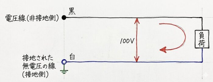一方、対地電圧は電線により異なり、非接地側電線のL(黒色)は100 V、接地側電線のN(白色)は0 Vとなる。
