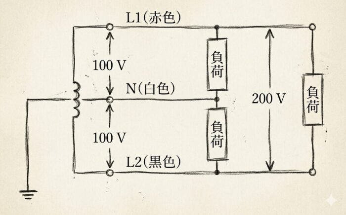 真ん中の接地側電線 N (白色) と非接地側電線 L1 (赤色) または L2 (黒色) を使用すると100 Vの電圧が2回路
