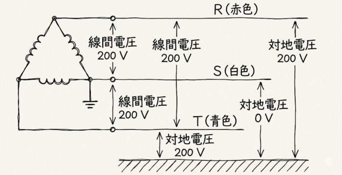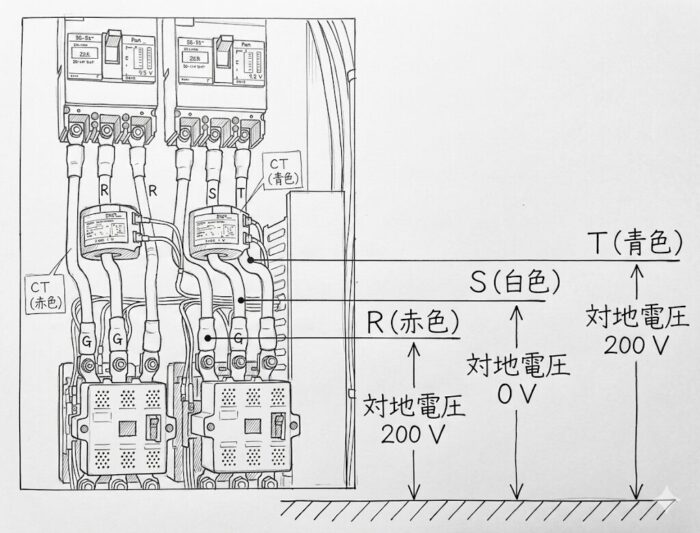 非接地側電線(R:赤色、T:青色)の2本は200V、接地側電線(S:白色)は0Vとなる。