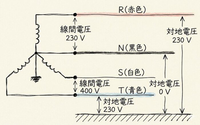 非接地側電線(R:赤色、S:白色、T:青色)と接地側電線(N:黒色)間の電圧は230 Vとなる。