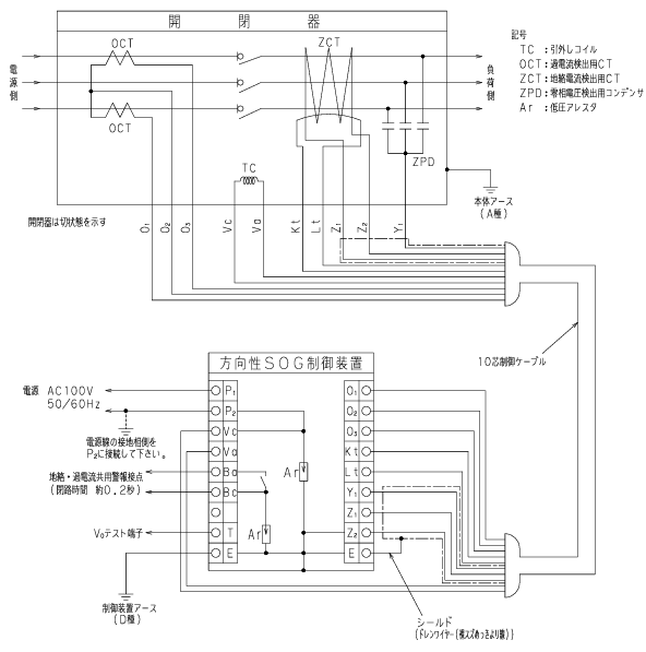 - 地絡事故時は、SOG制御装置(地絡継電器)が作動し、開閉器を開放させる。