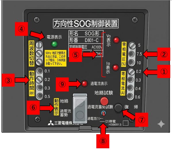 | ⑧試験スイッチ | 地絡及び過電流事故を模擬した試験ボタン トリップ出力と同時に、動作表示をさせる。 |