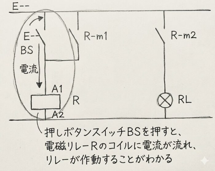 押しボタンスイッチを押すと電磁リレーのコイルに電流が流れ