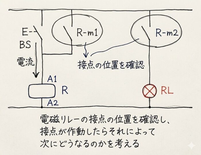 次に何が作動するのかを考える。上図回路では、電磁リレーのメーク接点R-m2が閉じると
