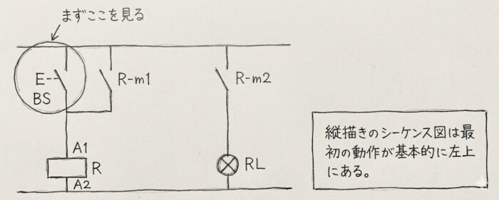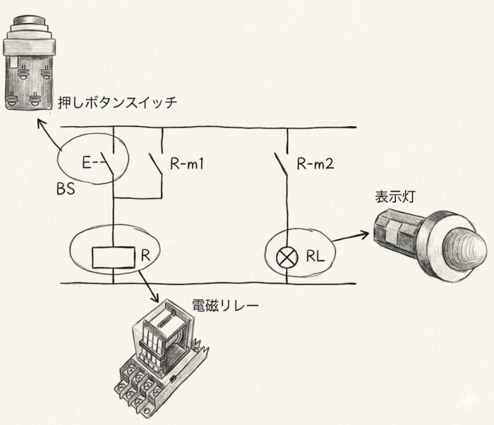 ②上回路では、左上には押しボタンスイッチのメーク接点があることがわかる。