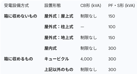 受電設備方式と主遮断装置の容量制限一覧