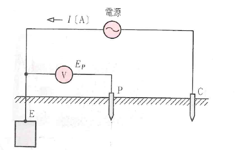 左図のように接地極Eに補助接地極P, Cを用いて交流の試験電流Iを流すと