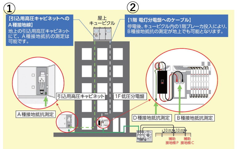 ●需要家内地上に引き込み用高圧キャビネットが存在し、A種接地がキュービクルとの共用接地の場合、地上での測定が可能。
