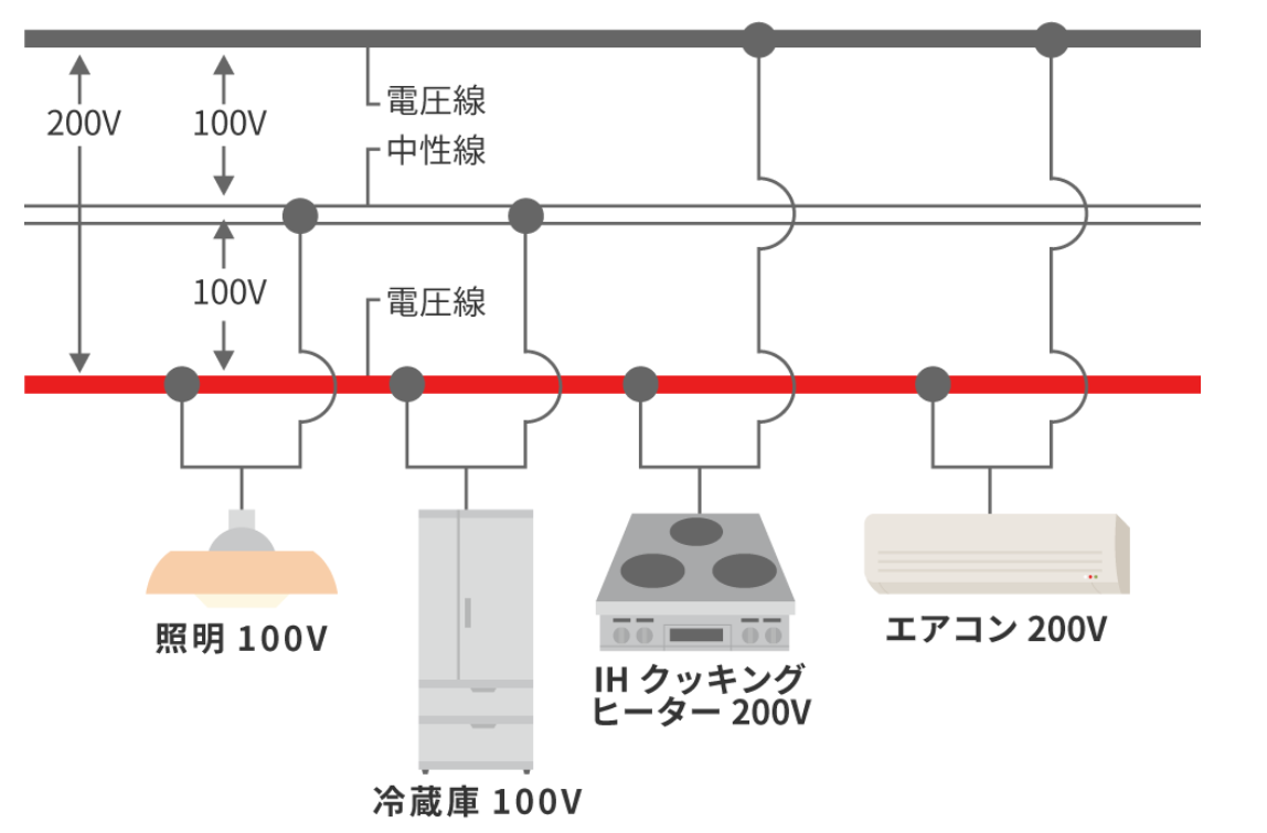 - 100V: 電圧線Aまたは電圧線Bと中性線の間に接続することで、100Vの電気を使用できる。これは、照明器具、テレビ、冷蔵庫などの一般的な100V仕様の家電製品に使われる。