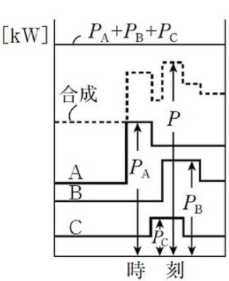 破線で示した合成電力の最大値Pは、個々の需要家の最大電力の総和(PA + PB + PC)より小さいのが普通となる。最大電力の総和と合成最大電力の比を不等率といい、1より大きな値になる。