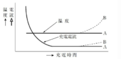 つまり、同図のB曲線が示すように、完全充電状態に達したあとも充電電流と温度が増加し、発熱を生む。