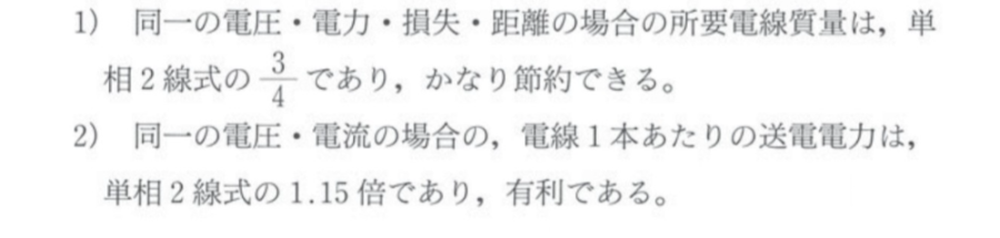 効率よく電力を輸送するという観点から日本では三相3線式が主流となっている。