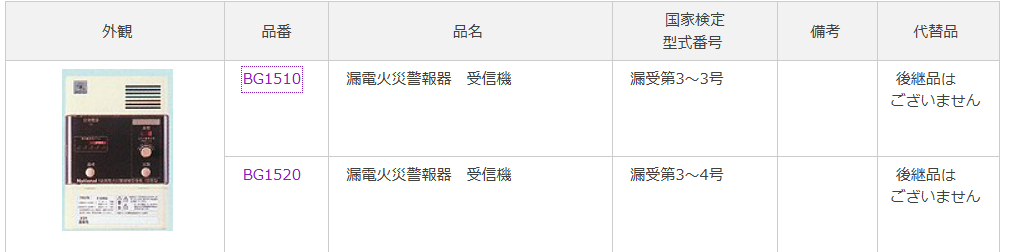 Panasonic 漏電火災警設備 生産終了品 サイトより引用