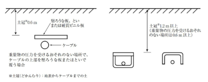ケーブル(地中電線)は、車両やそのほかの重量物の圧力を受けるおそれのある場所では1.2m以上、