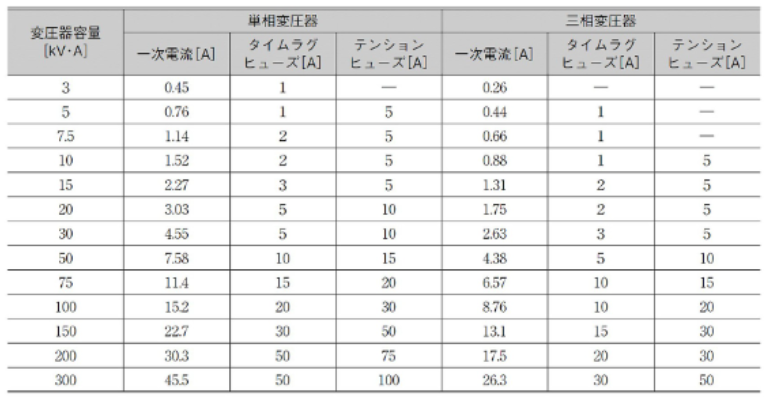 ②使用するヒューズの定格電流は、変圧器の定格電流に適合しているか(下記表参照)