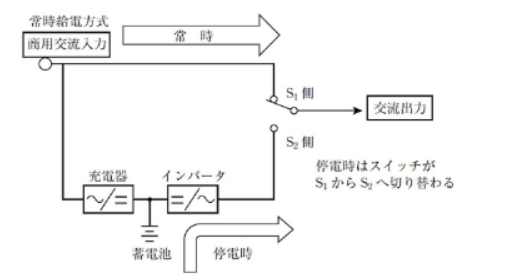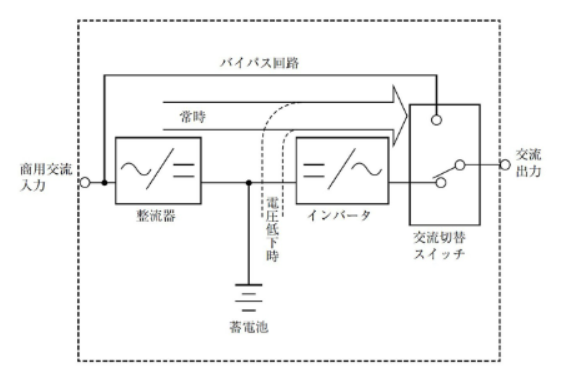 UPSは、蓄電池とインバータを組み合わせて、商用電源の瞬低や、停電時にコンピュータなどの負荷機器を停止させることなく、電源を確保する交流電源システムのこと。