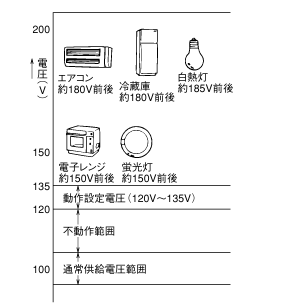 下図のように中性線欠相による異常電圧が135Vを越えると1秒以内で遮断し,電気器具の絶縁劣化,焼損を防ぐ。